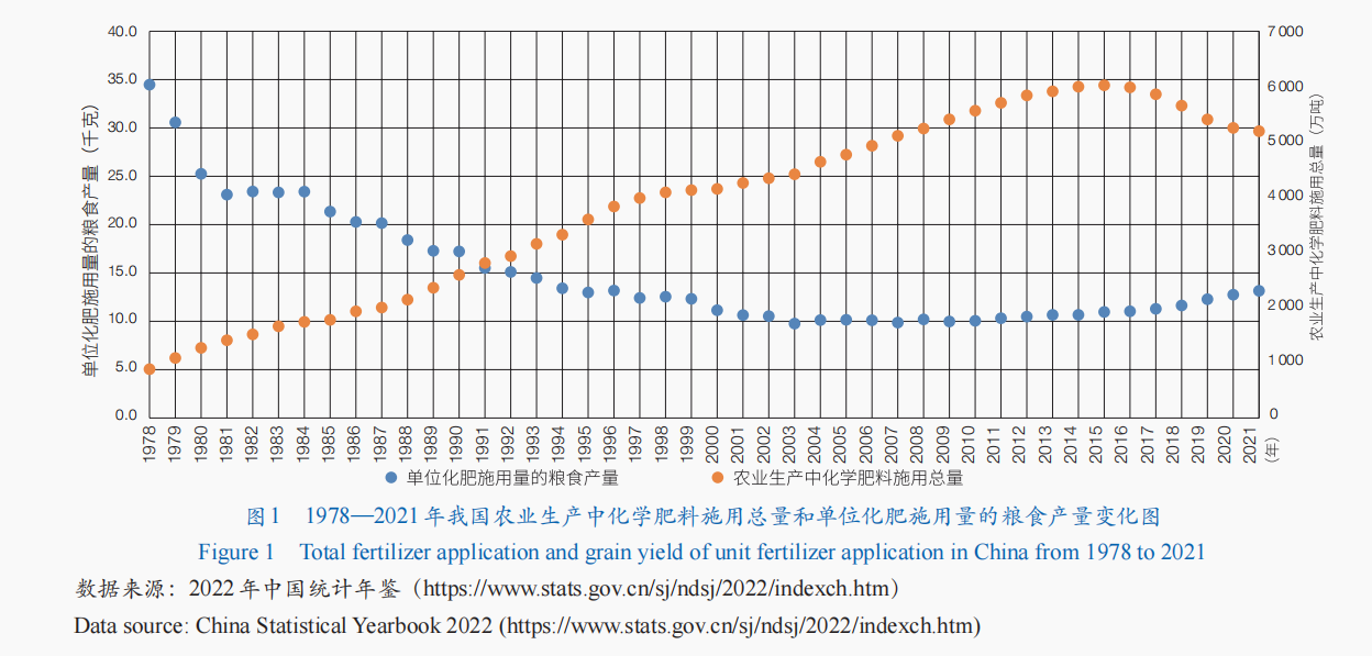 粮食安全是国家安全的基础。新中国成立以来,我国粮食生产取得巨大成就,用不足全球9%的耕地解决了全球约20%人口的吃饭问题。推动粮食产量增加的主要因素包括农业基础设施改善、农业物质装备水平提高、农业科技进步加快和农业经营体制改革等多方面的举措。1978年改革开放以来,我国粮食单位面积产量(以下简称=◆“单产”)由167.5千克/亩(2 527千克/公顷),提高到2021年的387千克/亩(5 805千克/公顷),翻了2.3倍;我国农业生产中化学肥料(以下简称“化肥”)投入增加了5.9倍,农药投入增加了4●◇•.7倍(表1)。然而,我国化肥=▪□、农药的利用率仅为40%左右,未被充分吸收利用的化肥、农药造成了严重的环境污染•。与此同时,我国农业用水量达到3 644.3亿立方米▷▽,占2021年全国用水总量的61.5%。通过分析我国1978年至今的粮食产量和化肥施用量的关系,发现两者存在极显著的相关关系(p 0.001)。1978—2002年○◆,单位化肥施用量的粮食产量呈现逐年下降的趋势,即增加化肥施用量对于提升粮食产量的作用逐渐降低=…;2003—2015年,我国化肥总施用量的数据仍在攀升△•,但是单位化肥施用量带来的粮食产量却几乎不变,也就是说随着化肥施用量的增加◁☆,粮食增产已进入平台期;2015年开始,随着国家◇“双减”战略的提出,虽然化肥施用总量逐年减少…,但单位化肥施用量的粮食产量则出现了缓慢提升(图1)□。由此可见◆,我国化肥的使用已经严重超标,不仅无法促进粮食持续增产,而且不能被作物吸收利用的化肥还会进入土壤及水体▽☆=,造成严重的农业面源污染▲▷■。