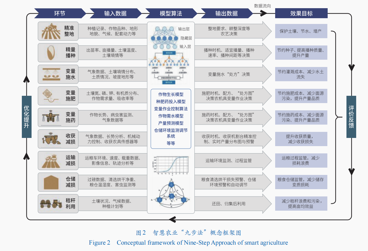 2005年中央一号文件《中央国务院关于进一步加强农村工作提高农业综合生产能力若干政策的意见》中■,首次提出了“加强农业信息化建设▽”。随后•,我国围绕作物生长发育△、种植管理管控、农业信息采集、质量检测等方面开展了大量工作☆◁●,在农业物联网产品和技术、农业传感器、水肥一体化等方面均取得了一系列成果▪▲,为农业大数据的获取提供了基础。《中华人民共和国国民经济和社会发展第十四个五年规划和2035年远景目标纲要》中明确提出“加快发展智慧农业,推进农业生产经营和管理服务数字化改造•…●”☆◁■。随着我国农村信息基础设施建设☆、农业规模化经营趋势、智慧农业技术进步,我国智慧农业迅速发展。围绕耕地土壤、种子▲、水资源、肥料和农药利用等方面,科研人员开展了大量的单项技术研究或集成技术研究,部分技术环节已取得突破,并在应用示范中取得了显著效益。农业生产是一个复杂的系统工程,围绕产前、产中▷、产后的粮食生产全链条,针对从耕整地到粮食入库的全过程…☆,通过将碎片化的单点技术进行串联,为我国农业生产节本增产增效提供技术支撑,实现•☆△“藏粮于技”。为此■○,本文将控制论的概念引入农业生态系统,提出了智慧农业助力农业生产的核心“九步法”,即“两精”•“三变”▲…“三减”-◆“一用”(图2)。利用信息技术打通农业生产全链条数据流△▲,通过农业大数据积累,开发算法和模型挖掘数据价值,建立智慧农业决策系统,并用智能农业机械装备实现精准执行系统指令。同时,智能农业机械又可在作业的同时采集数据,实现数据流的闭环-■。随着系统不断积累数据,进一步加强数据驱动的模型训练,使系统变得“越来越聪明□▼◁”,实现精准决策,进一步提升农业科技的增产增效潜力。