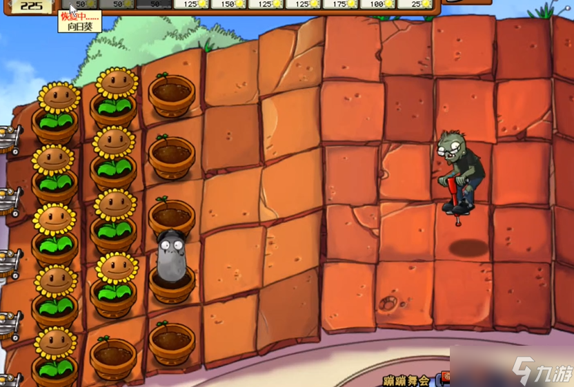 游戏开局阶段,你需要快速在第2列和第3列种植向日葵,以尽快积累阳光资源。预留第一列的位置,当第一个蹦蹦僵尸出现时,立即在同一行的最后一格放置倭瓜,可以瞬间消灭它,接着用模仿者倭瓜处理下一个僵尸,这样能稳住前期局势。